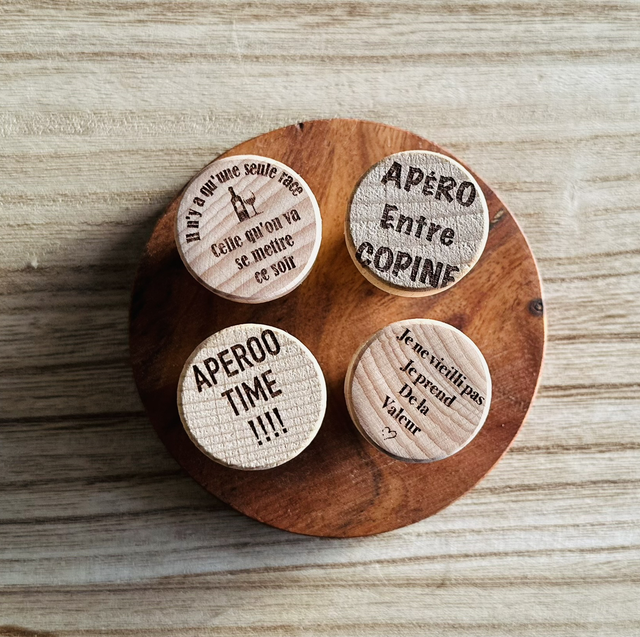 Bouchons en liège, tête de bois, si vous souhaitez un message différent, laisser un commentaire dans votre commande avec votre e-mail afin de faciliter les échanges