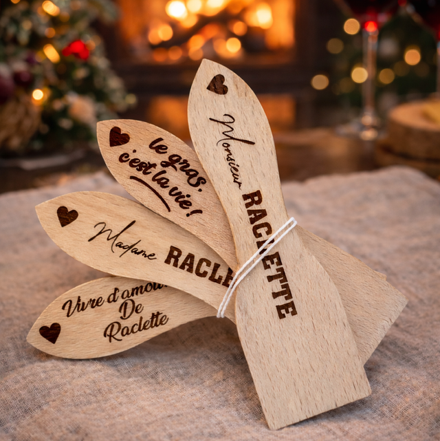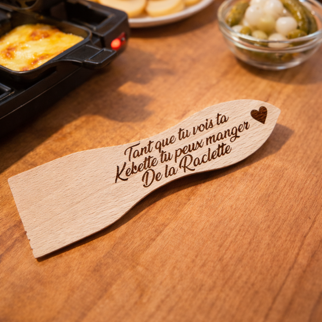 Parfaite comme cadeau personnalisé pour les amateurs de raclette, cette spatule en bois est aussi une idée originale pour un anniversaire, une soirée ou les fêtes.